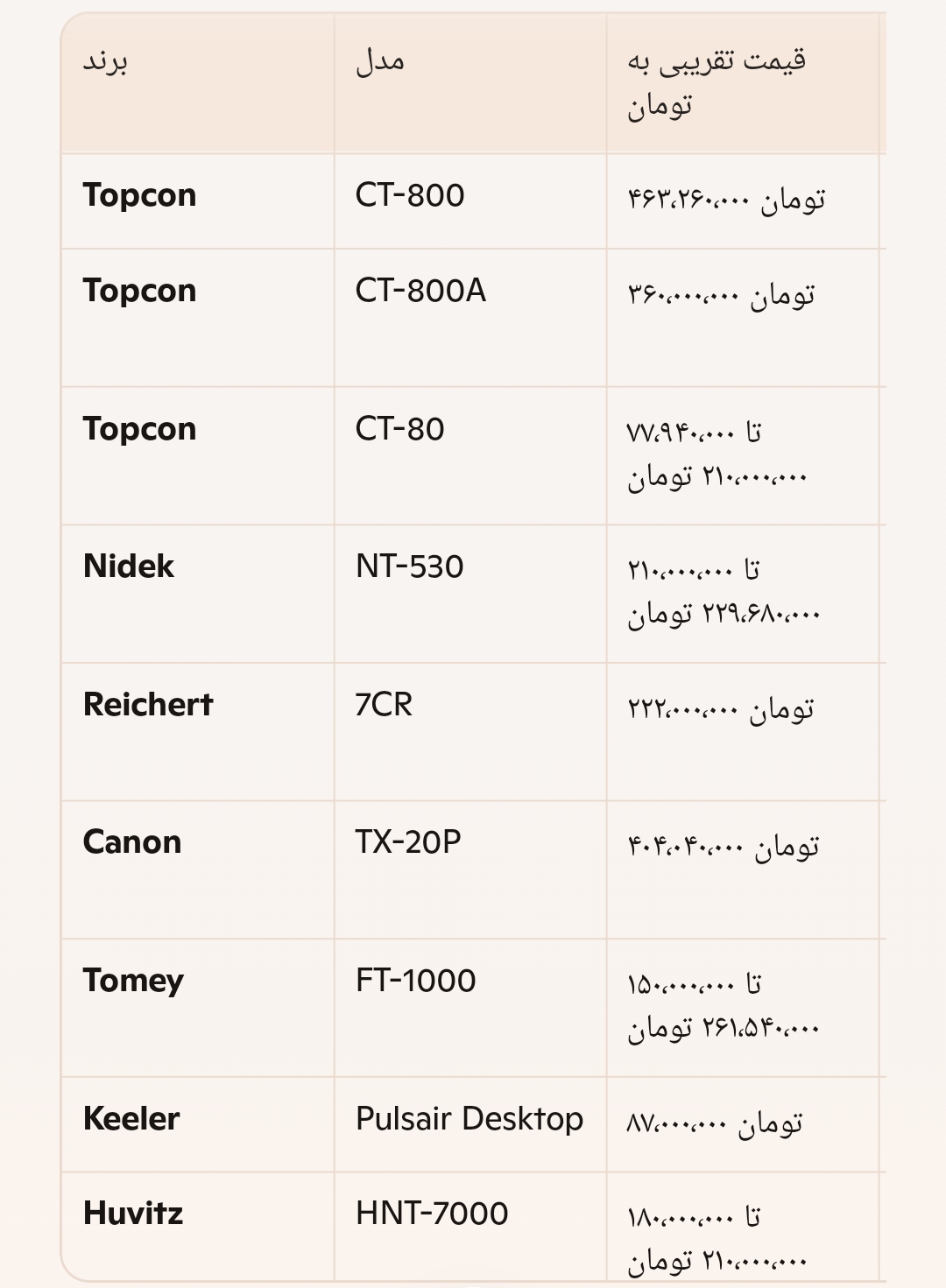دستگاهها شامل مدلهای معتبر جهانی مانند Topcon، Nidek، Canon، Reichert، Tomey، Huvitz و Keeler هستند.